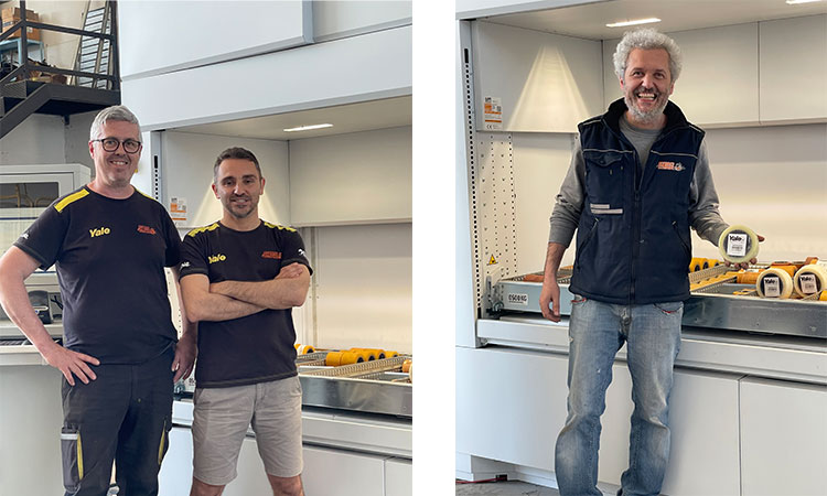 A sinistra: Samuele Nori, responsabile tecnico, con Alessandro Peverini, braccio destro del titolare Fabrizio Boccarossa; a destra: il magazziniere Luca Biagiarelli accanto al nuovo magazzino automatizzato.