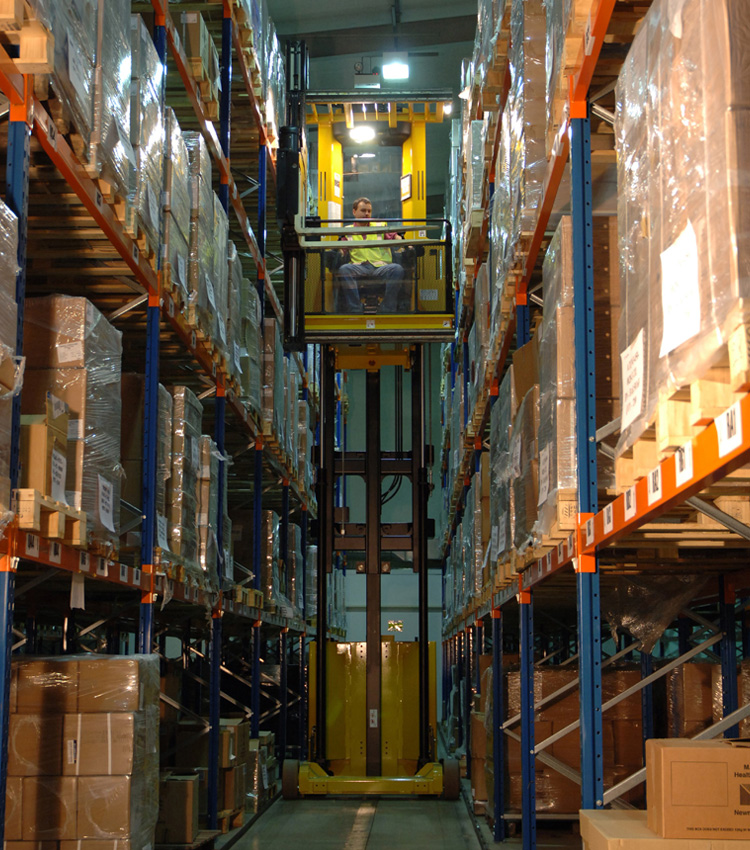 1. Scaffalature porta pallet: sono presenti in tutti i magazzini del mondo. Si distinguono per il fatto che i pallet sono appoggiati sui correnti. Se la scaffalatura è accoppiata, si parla di scaffale bifronte. Nell’immagine qui sotto si nota un operatore che si accinge a prelevare un pallet da uno scaffale porta pallet per mezzo di un MTC, un carrello trilaterale per corsie molto strette.