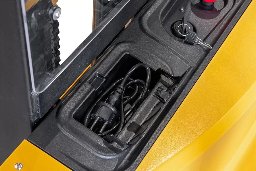 - Maggiore flessibilità grazie al caricabatterie integrato da 24 V/15 A agli ioni di litio e al connettore di facile accesso, che permette di collegare questo stoccatore Yale ovunque. L'indicatore della batteria e l'avviso di ricarica consentono agli operatori di avere il controllo e aiutano i magazzini ad effettuare cariche di biberonaggio dello stoccatore, ottimizzando i tempi di piena operatività, con la batteria che si ricarica completamente in appena quattro ore.